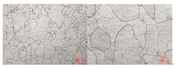 图(tu)4.经热(re)处置后的整机(ji)꧅Z标的目的截面♊的微布局;左50x(白(bai)色尺(chi)标显(xian)现(xian)200um)、右 100x(白(bai)色尺(chi)标显(xian)现(xian)100um)