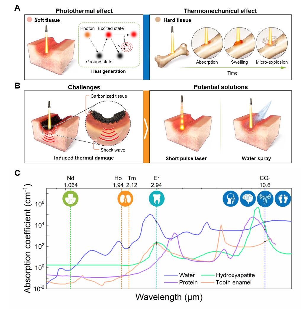 与基于机械加工的传统手术东西差别,激光手术刀经由过程怪异的构造光学感化完成高效生物构造加工。文章具体论述了针对软构造与硬构造切除的光热融化与光致机械融化机理,并会商了水介导和超短脉冲激光手艺在减缓构造固结、碳化等热毁伤方面的研讨停顿(图1)。进一步地,文章阐发了以Nd、Ho、Tm、Er和CO2激光为主的红外医疗光源在牙科、泌尿内科等多种手术范畴的特色、上风与利用代价,并夸大新型手术激光光源手艺的前进给激光传输介质在矫捷性、不变性和操控性等方面带来的庞大挑衅。