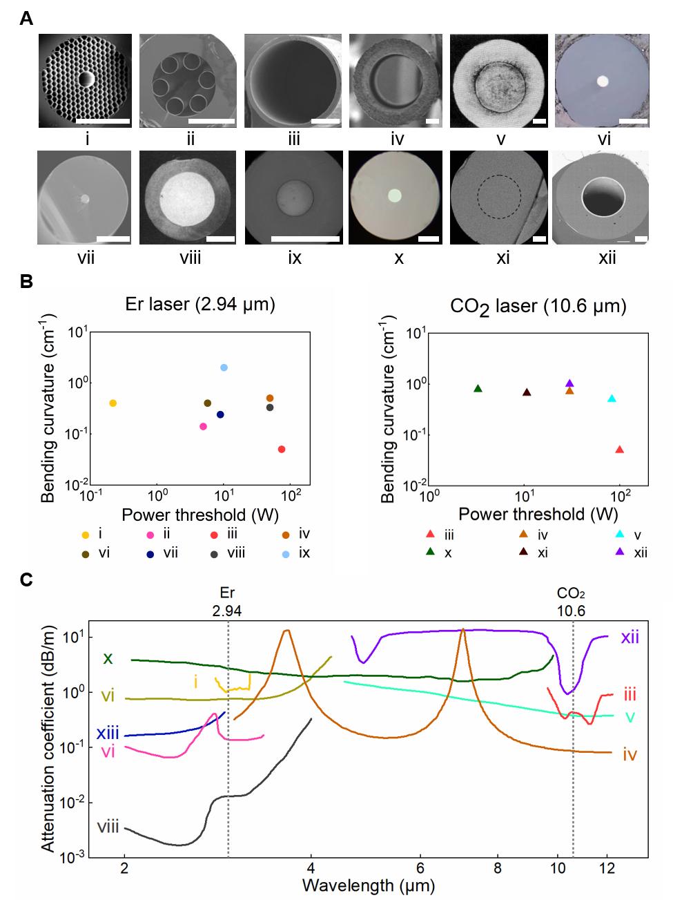 激光传输介质作为激光手术刀体系中的关头器件,须要不变地将激光能量递送至特定手术部位。文章体系论述了导光臂、空心波导和红外光纤三类首要医用激光传输介质的研讨近况,并夸大小标准、高矫捷性的红外光纤器件在微创内科医疗中的利用潜力。文章周全阐发了红外光纤器件的研讨停顿,从激光传输阈值、光学消耗和机械柔性角度比拟了光纤在Er激光和CO2激光中的器件机能(图2),并指出高光学消耗和低机械强度是限定红外光纤器件在内科手术中深度利用的关头身分。最近几年来多资料纤维手艺的疾速成长,差别光、力、电、磁等物理机能的复合资料高度一体化集成,为开辟高柔性低消耗中红外光纤并进一步晋升手术东西功效性供给了靠得住研讨撑持。
